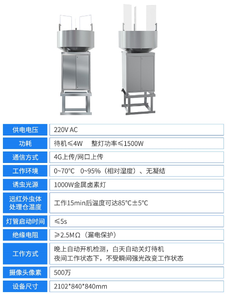 设备有白色和黄色箱体两种款式可选,若选购 4G 型,设备还可将降雨状态、光照状态、引虫灯状态、风机状态、电池参数等上传到农业四情测报平台/智慧农业大数据平台。