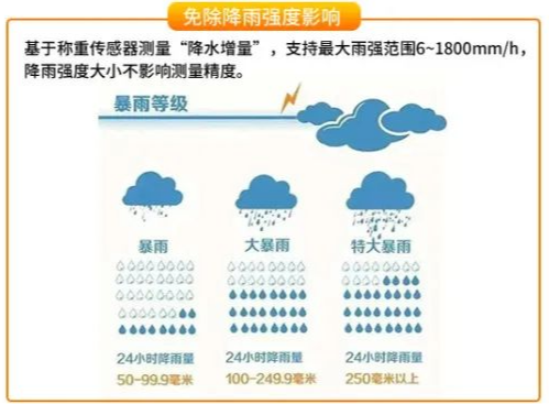 称重式雨量计实时降水强度测量范围为 6~1800mm/h,通过建立数学模型将高精度的重量传感器测量的数据转换为降水量、降水强度等要素信息,并且,相较于传统翻斗式雨量计,称重式雨量计在各种雨强情况下均能保证高精度测量。