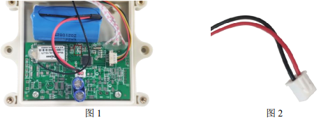 产品安装前要安装电池,首先拆开外壳,拆解外壳时请不要用力拖拽,防止扯断壳体 内部的引线,将通用对插锂亚电池插到电路板的电池插座处,此时指示灯(电池上方红框圈出位置)会快速闪烁,闪烁完成后保持熄灭状态,电池放在电路板上方位置,如图 1。 (注:若自行购买电池需注意插头的引线,引线如图 2)